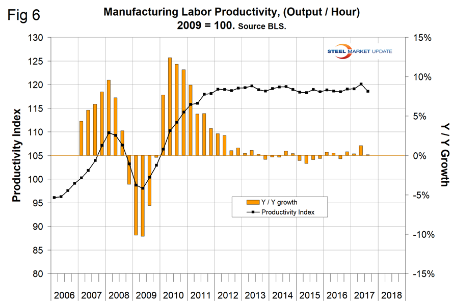 The Bureau of Labor Statistics reported that in Q2 2017 manufacturing productivity improved by an upwardly revised 1.3 percent year over year (Figure 6). This was the highest growth rate since Q4 2012. In Q3 (latest data available), growth fell back to 0.1 percent, meaning that productivity is almost exactly where it was in Q3 2016.
