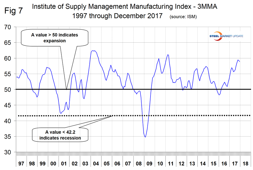 The Institute for Supply Management’s Manufacturing Index is a diffusion index. ISM states: “Diffusion indexes have the properties of leading indicators and are convenient summary measures showing the prevailing direction of change and the scope of change. An index value above 50 percent indicates that the manufacturing economy is generally expanding; below 50 percent indicates the opposite.” Figure 7 shows the 3MMA of the ISM index from January 1997 through December 2017 with an improving trend since January 2016. In October, the 3MMA of the index at 59.43 was the highest since April 2011, but fell back to 58.87 in December. Historically, the ISM Index is currently very strong.