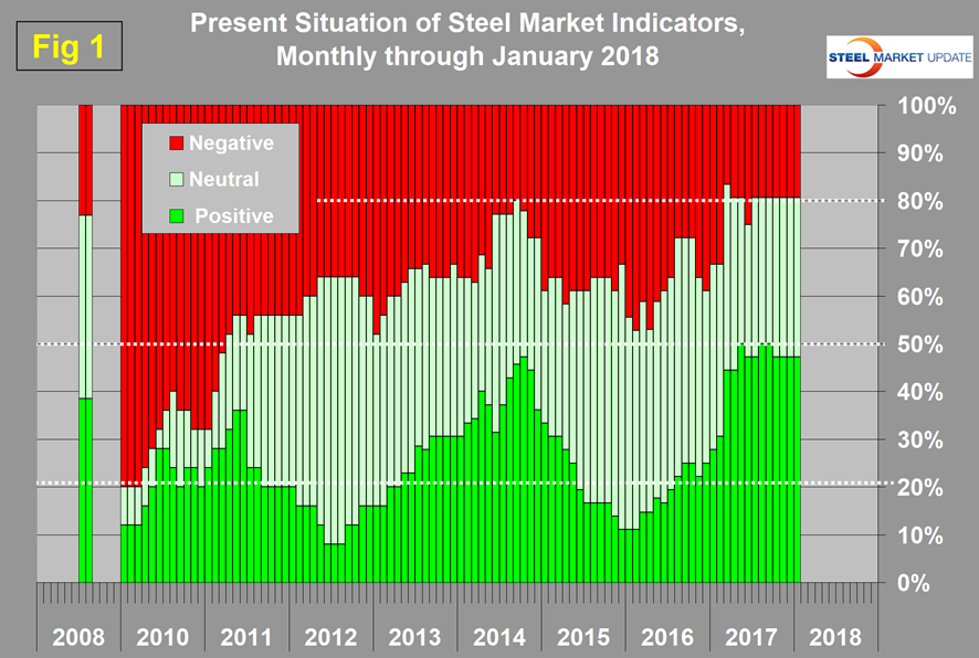 The trends of major key market indicators are the best they have been since Steel Market Update first performed this analysis in January 2010. Data released in January shows that 47.2 percent of the 36 indicators are historically positive with only 19 percent negative. The balance is within the band of historically normal. The total of positive and normal has not changed in six months. However, there have been frequent changes in the detail. Trends improved with 83.3 percent of the indicators heading in a positive direction, up from 61.1 percent in October and from 72.2 percent in November. Trends lead the present situation by about four months.