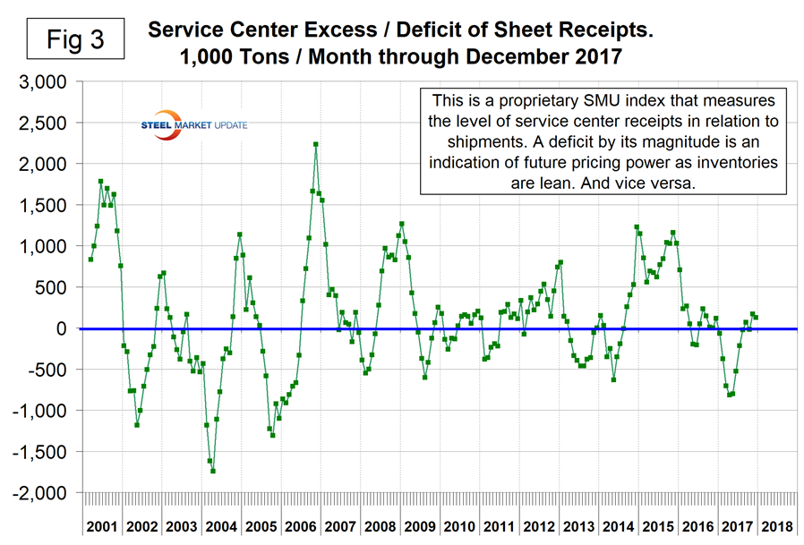Our observations about trends in the January data are as follows: In the General Economy section of Table 1, there were three tend reversals. The Chicago Fed National Activity Index and Consumer Confidence both took a small retrograde step from levels that were historically very high. (Consumer confidence actually improved in January, but the 3MMA declined). The Broad Index of the U.S. dollar declined, which we regard as a positive move because of the effect on net trade. One of the SMU indexes reversed direction. Service center excess of sheet products declined in the December data. This is a proprietary SMU calculation. We regard an inventory deficit to be positive in terms of pricing power. In December, the surplus declined from 170,000 tons to 126,000 tons (Figure 3). Historically, this is very close to zero, therefore we are presently in a situation of negotiation neutrality.