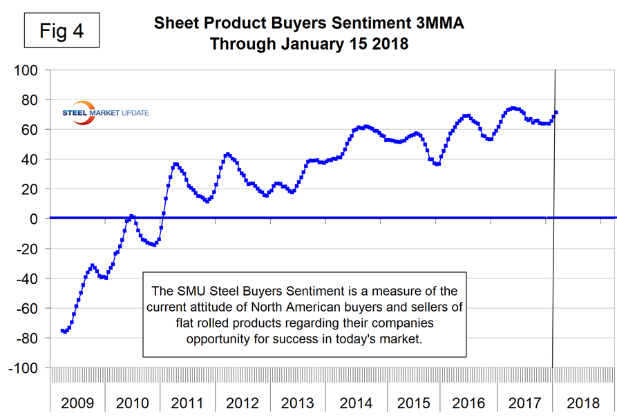 Steel buyers’ sentiment continued to strengthen through mid-January after revering direction in December. Sentiment is historically very high (Figure 4). There was one trend reversal in raw materials prices following the December situation when all were rising. We regard rising raw materials prices as positive and indicative of a strengthening market. In January, the price of coking coal took a step back as buyers remained on the sidelines.