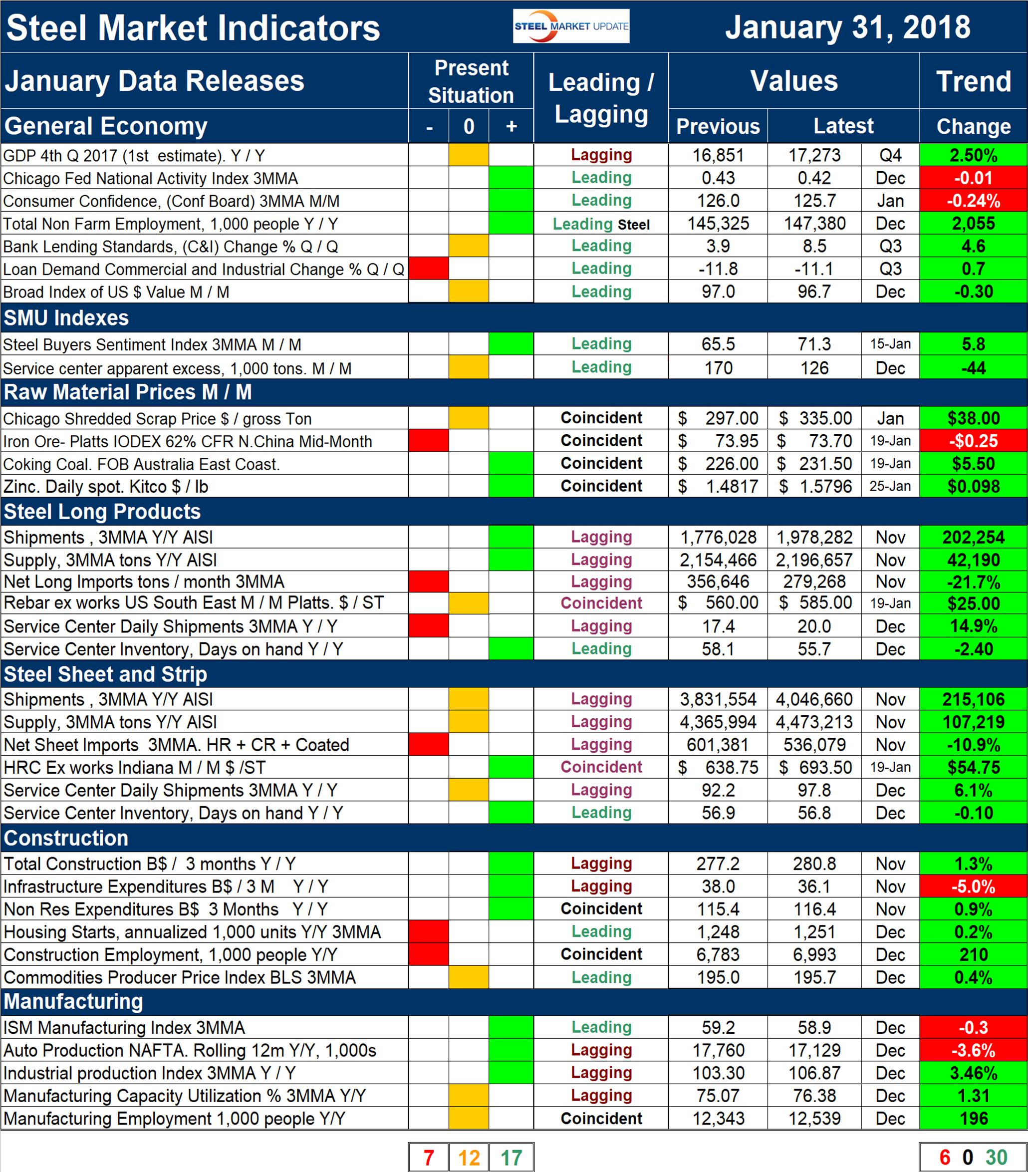 Explanation: The point of this analysis is to give both a quick visual appreciation of the market situation and a detailed description for those who want to dig deeper. It describes where we are now and the direction the market is headed, and is designed to describe the situation on a specific date. The chart is stacked vertically to separate the primary indicators of the general economy, of proprietary Steel Market Update indices, of raw material prices, of both sheet and long product market indicators, and of construction and manufacturing indicators. The indicators are classified as leading, coincident or lagging as shown in the third column.