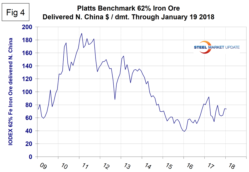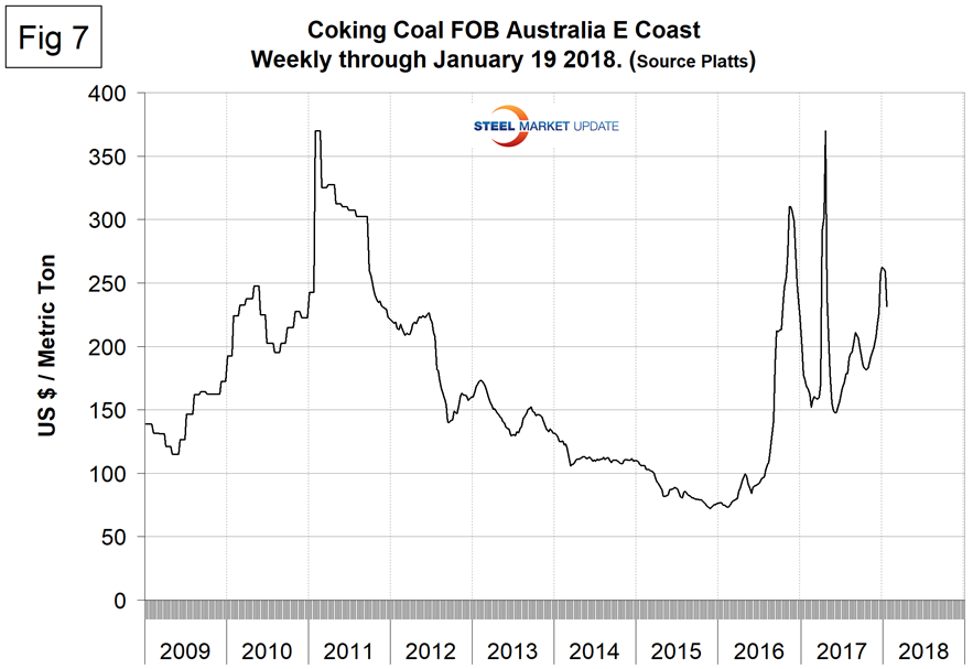 Coking coal prices have been highly erratic in the last 14 months. A mixed picture of pricing sentiment has been evident in January. On Jan. 3, 2018, Platts reported that global steel prices could continue to rise in Q1 as surging coking coal prices work their way through the blast furnace cost structure. Since the beginning of November, premium hard low volatile coking coal prices have risen from $179 per metric ton to $262.25 FOB Australia’s East Coast (Figure 7). On Jan. 19, Argus reported that Asia Pacific coking coal prices had stabilized as bids crept higher and producers resisted further cuts in offers. On Jan. 25, Platts reported that the price of premium low volatile hard coking coal had tumbled in the previous week as declining offers failed to stimulate demand.