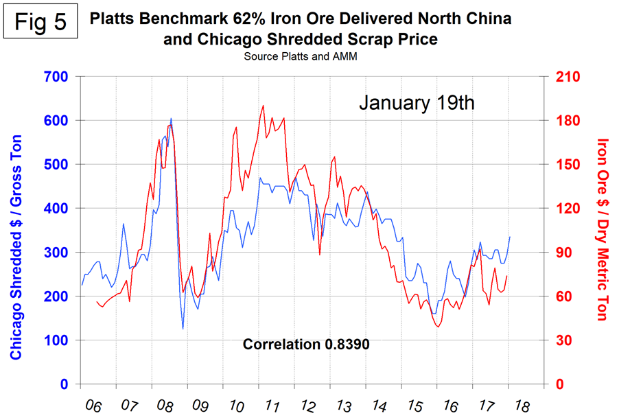 Figure 4 shows the Platts IODEX of 62% Fe delivered North China since January 2009. The Index recovered to $92.30 on March 17 but stood at $73.70 on Jan. 19. Reuters Australia reported that iron ore prices are expected to average $51.50 per metric ton this year, down 20 percent from 2017 because of rising global supply and moderating demand from top importer China as its steel sector shrinks. The world’s top mining companies, BHP and Vale, rely heavily on iron ore sales for the bulk of their revenue despite efforts to diversify more into other industrial raw materials such as copper, aluminum and coal. Brazil-based Vale is planning to lift iron ore exports 7 percent in 2018 to 390 million metric tons. In Australia, Rio Tinto and BHP, along with Fortescue Metals Group, aim to add about 170 million tons of new capacity over the next several years. The forecast price decline, from an average of $64.30 a ton in 2017, continues into 2019 when the steelmaking raw material will average only $49 per metric ton, according to the Department of Industry, Innovation and Science. “The iron ore price is expected to experience some ongoing volatility in early 2018 as the market responds to uncertainty regarding the impact of winter production restrictions on iron ore demand,” the department warned in its latest commodities outlook paper. China imported over a billion tons of iron ore in both 2016 and 2017.