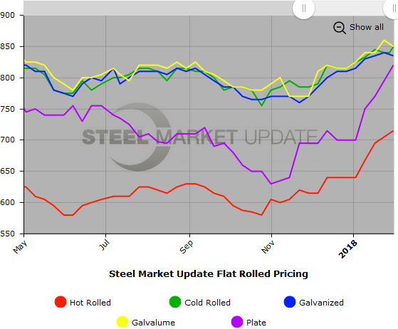 SMU Note: Below is a graphic showing our hot rolled, cold rolled, galvanized, Galvalume, and plate price history. To use the graph’s interactive capabilities, you must view it on our website here. If you need help navigating the website or need to know your login information, contact us at info@SteelMarketUpdate.com or 800-432-3475.