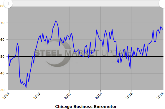 Below is a graph showing the history of the Chicago Business Barometer. You will need to view the graph on our website to use its interactive features, you can do so by clicking here. If you need assistance logging into or navigating the website, please contact our office at 800-432-3475 or info@SteelMarketUpdate.com.