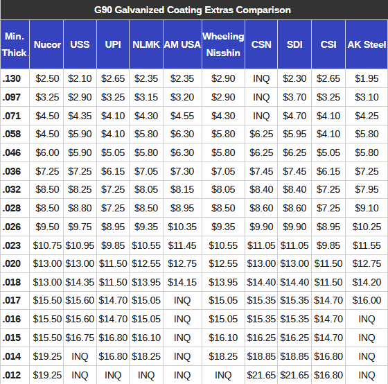 Note: The mill coating extras and a line item comparison can be found on the SMU website under the resources tab. The G90 table shown in this article is on our website along with G30 and G90 comparisons.