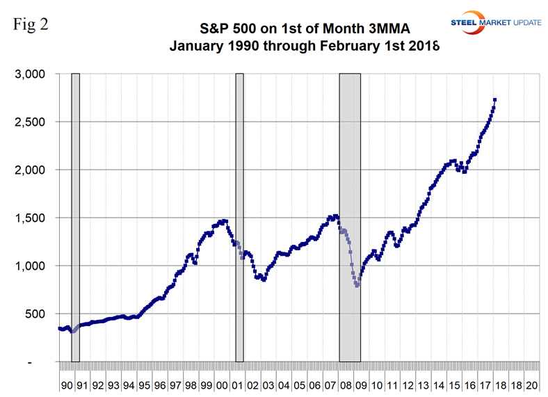 Figure 2 shows the S&P 500 on the first day of each month from January 1990 through February 2018. The stock market did predict the recession of 2001 but failed in 2008.