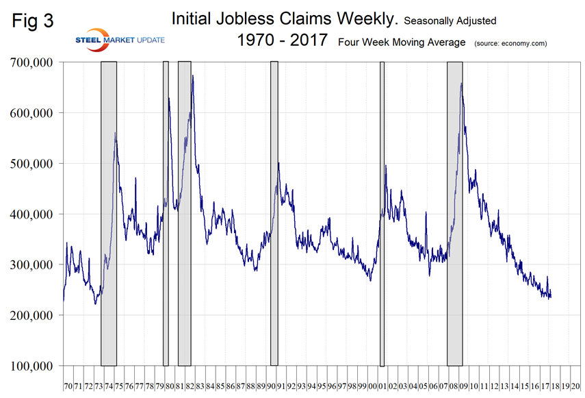 Figure 3 records new weekly claims for unemployment compensation. This indicator failed to predict the 1981 and 2008 recessions. It had a lead of over a year on the other four.