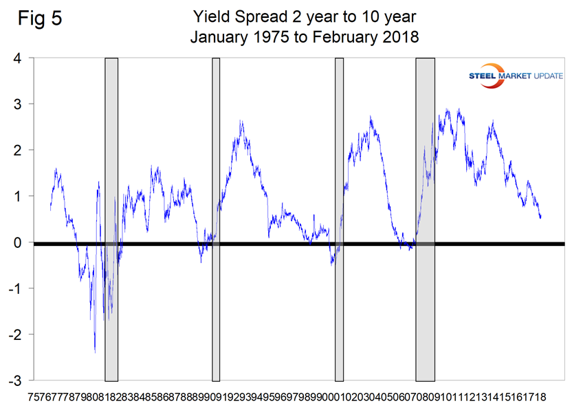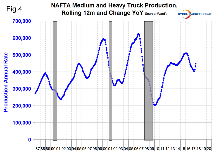 Figure 4 shows monthly assemblies of medium and heavy trucks in NAFTA. Evidently, the auto companies’ economists have a good read on future business activity. They correctly anticipated and acted in advance of the 1990, 2001 and 2008 recessions. They were nervous in 1995 and 2016, which turned out to be false alarms. This illustrates our belief that we need to be cognizant of all these indicators simultaneously to get the best view of the future.