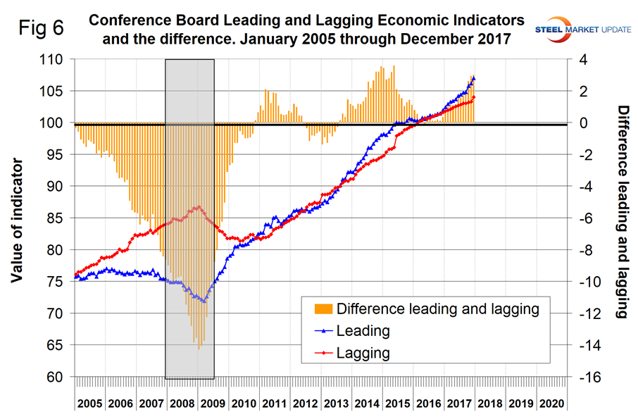 Figure 6 is the chart we like the best, though we have no history before 2008. This is The Conference Board leading and lagging economic index. We have subtracted one from the other in the rationale that if the lead is better than the lag, the situation is improving, or vice versa. The lead minus lag inverted three years in advance of the 2008 recession; certainly by 18 months before the big event it was clear something was happening. At present, this indicator is in an ascending mode.