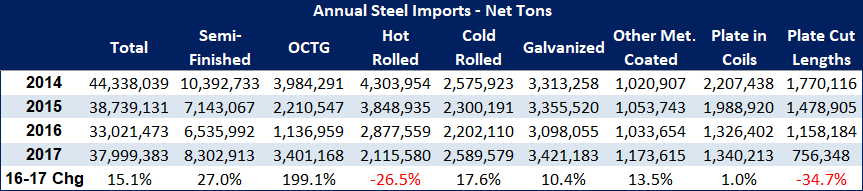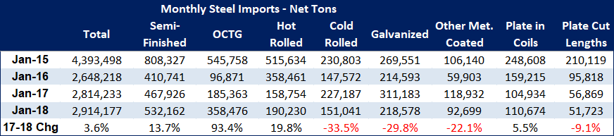 Semi-finished imports rose by 14 percent, OCTG by 93 percent, hot rolled by 20 percent and plates in coils by 6 percent over January 2017 levels.