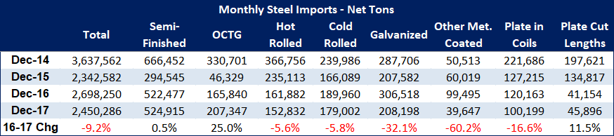 At 2,450,286 tons, December 2017 imported the least tonnage compared to 2016 and 2014. All items followed by SMU declined compared to December 2016 with the exception of semi-finished (slabs/billets), OCTG and CTL plate (see table).