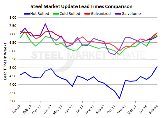 Hot rolled lead times now average 5.07 weeks, up from 4.50 weeks in mid-January, and at the highest level since June 2016.