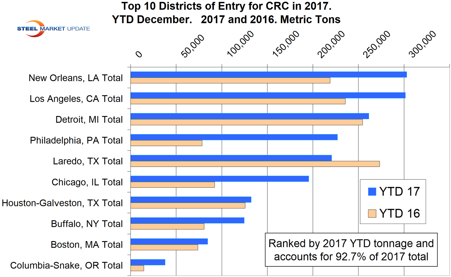 The table included here (click to enlarge) is a small part of the detailed analysis of the cold rolled tonnage. The bar graph shows the tonnage of CR that entered the top 10 districts in year-to-date December for 2016 and 2017 ranked by 2017 tonnage. These 10 districts account for 92.7 percent of the grand total in 2017. New Orleans had the most tonnage through December 2017 followed by Los Angeles, Detroit and Philadelphia.