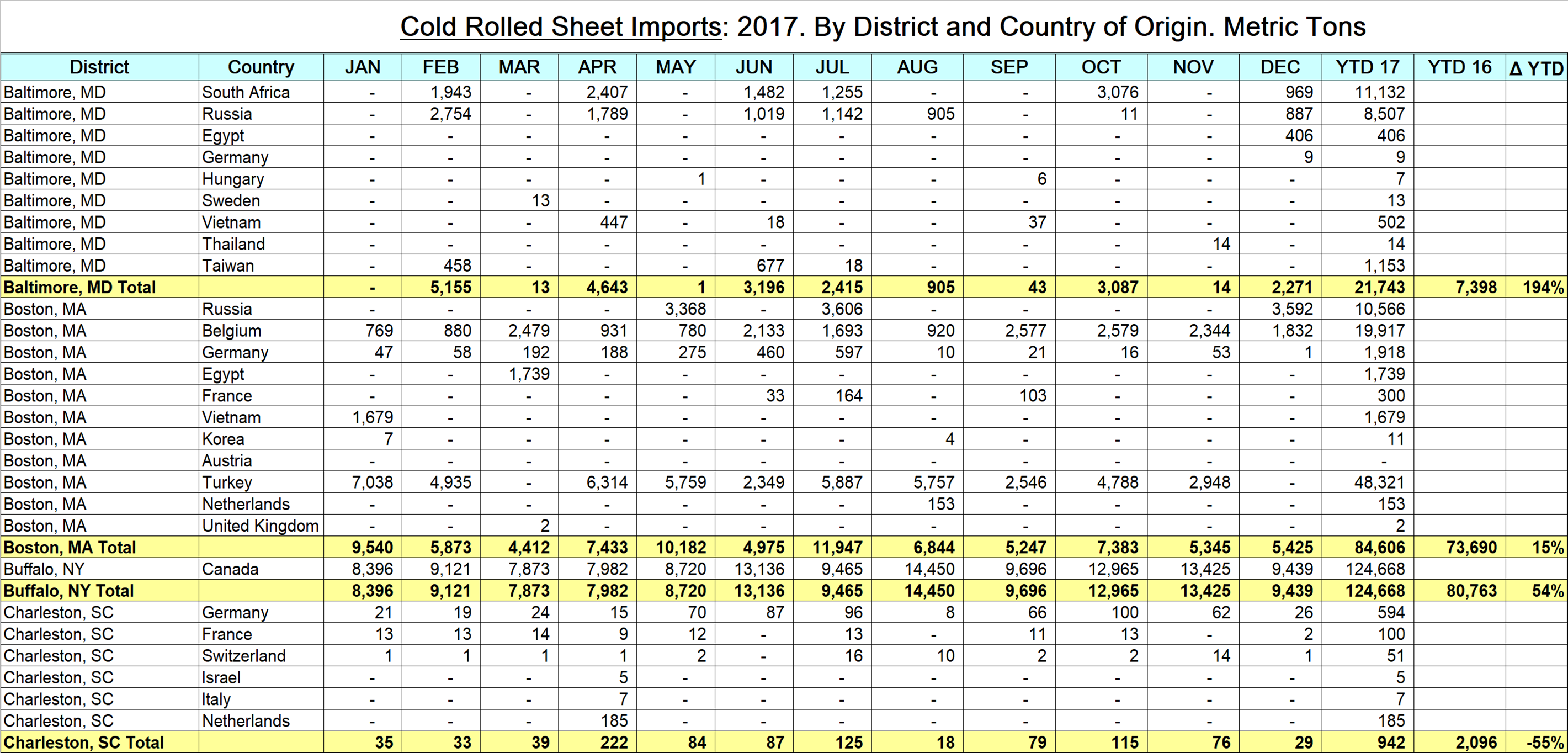 The data in these detailed reports is compiled from tariff and trade data published by the U.S. Department of Commerce and the U.S. International Trade Commission. Our other import reports are sourced from U.S. Department of Commerce, Enforcement and Compliance, aka the Steel Import Monitoring System. In the development of these reports by district and source country, we have discovered that the SIMA data for HRC and CRC contains some high-alloy steel such as stainless and tool steel, which have been misclassified at the ports. These alloy steels are not included in our detailed reports, which results in a small discrepancy between the two data sets, for CRC in particular and for HRC to a lesser degree.