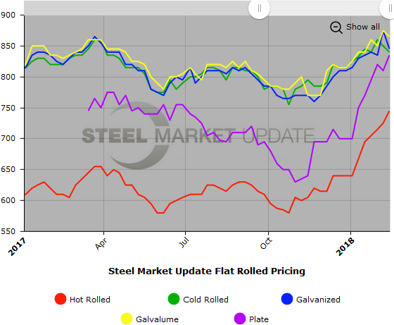 SMU Note: Below is a graphic showing our hot rolled, cold rolled, galvanized, Galvalume, and plate price history. This data is available here on our website with our interactive pricing tool. Note that plate prices are not yet available on our website, but we are in the process of adding that dataset. If you need help navigating the website or need to know your login information, contact us at info@SteelMarketUpdate.com or 800-432-3475.