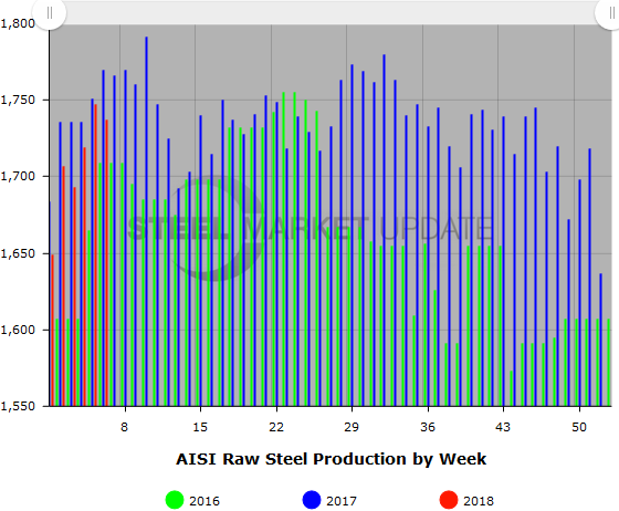 Below is a graph showing the history of weekly raw steel production. You will need to view the graph on our website to use its interactive features; you can do so by clicking here. If you need assistance logging into or navigating the website, please contact our office at 800-432-3475 or info@SteelMarketUpdate.com.