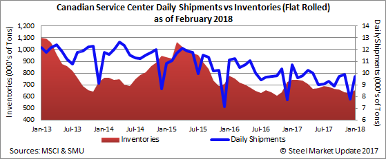 Steel shipments by Canadian service centers in January totaled 410,100 net tons, up 46.4 percent from December’s lull, but down 0.4 percent from January 2017, reports the Metals Service Center Institute (MSCI). On a daily basis, total shipments were 18,600 tons per day in January (a 22-day month), up from 14,700 tons per day in December (a 19-day month), but down compared to a year ago when they were 19,600 tons per day (a 21-day month). Total steel inventories at the end of the month were 1,154,000 tons, up 1.7 percent from last month, but down 2.1 percent from this time last year.