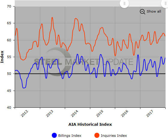 Below is a graph showing the history of AIA Architecture Billings Index and Inquiries Index. You will need to view the graph on our website to use its interactive features, you can do so by clicking here. If you need assistance logging into or navigating the website, please contact our office at 800-432-3475 or info@SteelMarketUpdate.com.