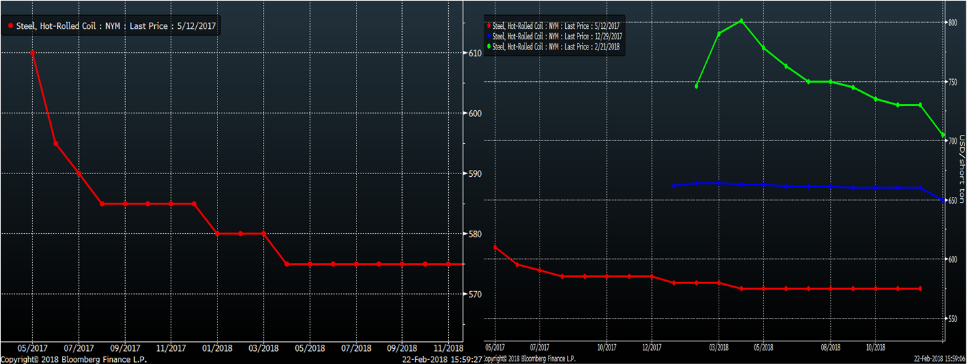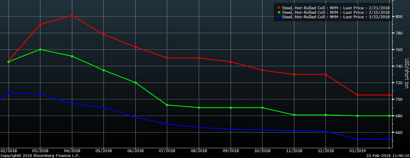 There have been massive gains in the HRC futures with April trading at $800 and up over $100/st in one month! The curve has become increasingly downward sloping as spot prices skyrocket, but don’t make the mistake of reading too much into the shape of the curve. It is true that prices in the second half are over $60 below April, but if the 232 recommendations are implemented, the curve’s shape could change dramatically, perhaps shifting into contango (upward sloping).