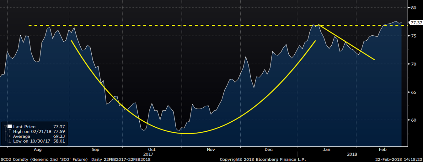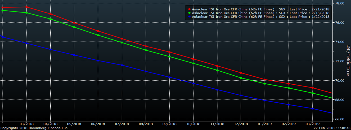 Iron ore is up nicely on the month with the curve maintaining its shape. Iron ore futures have been very quiet with China closed for the Lunar New Year.