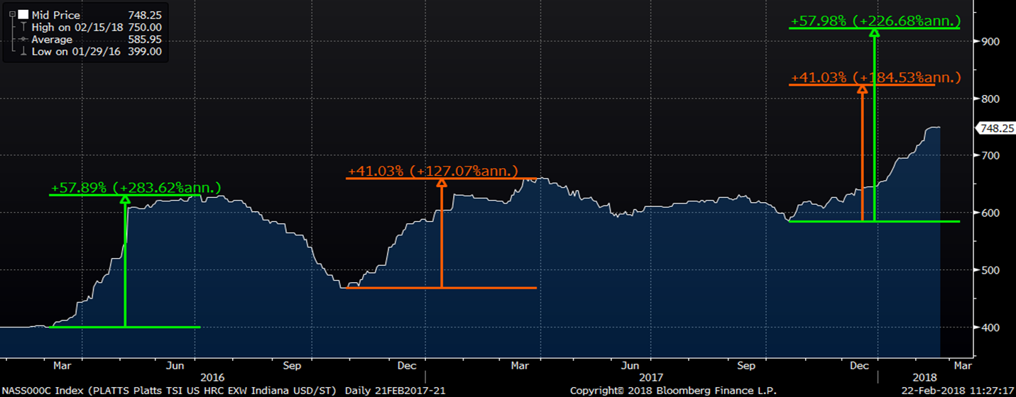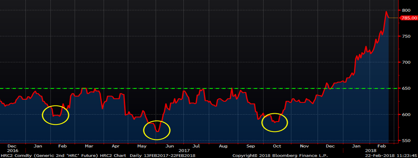 Last Friday, the Department of Commerce announced its 232 Investigation findings and recommendations. The HRC futures, which were already at ludicrous speed, immediately went plaid.