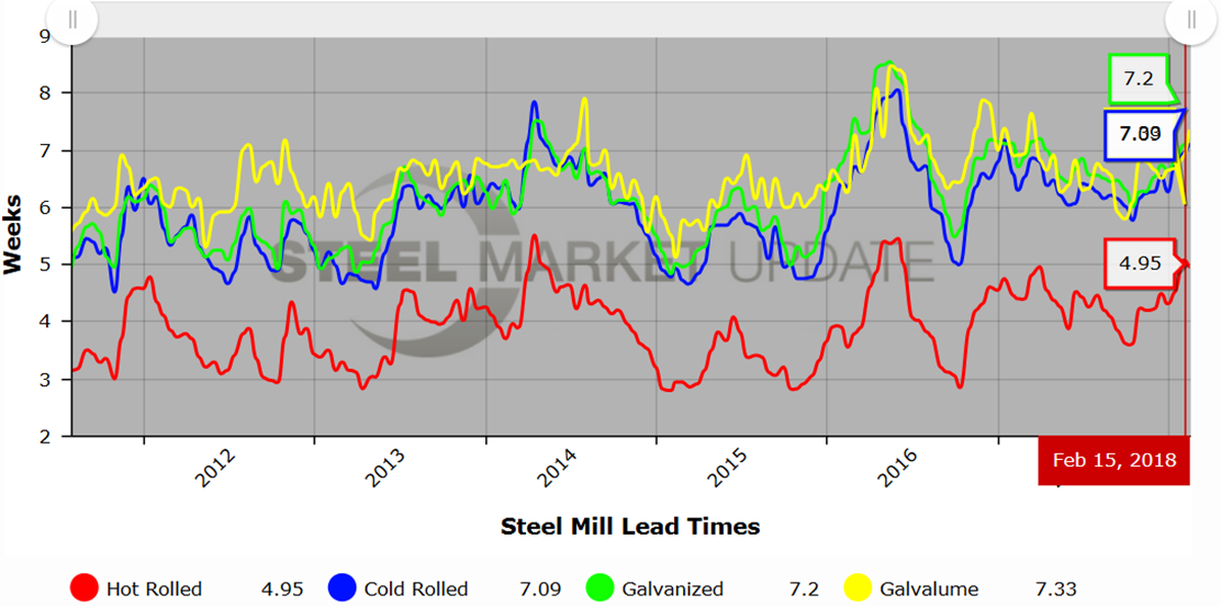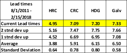 Taking the data from the chart above, all four lead times were approaching the second standard deviation of their six year average as of February 15th. Keep in mind that these lead times were before the 232 announcement.