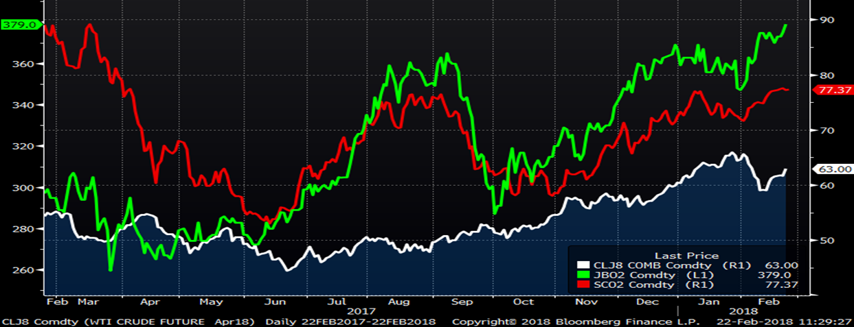 April WTI Crude (white), 2nd Month LME Turkish Scrap (green) & 2nd Month SGX Iron Ore (red)