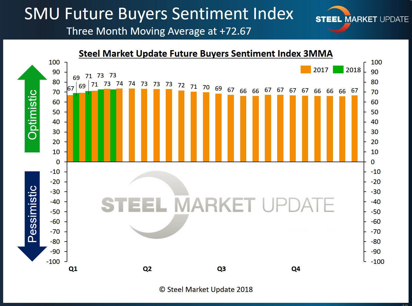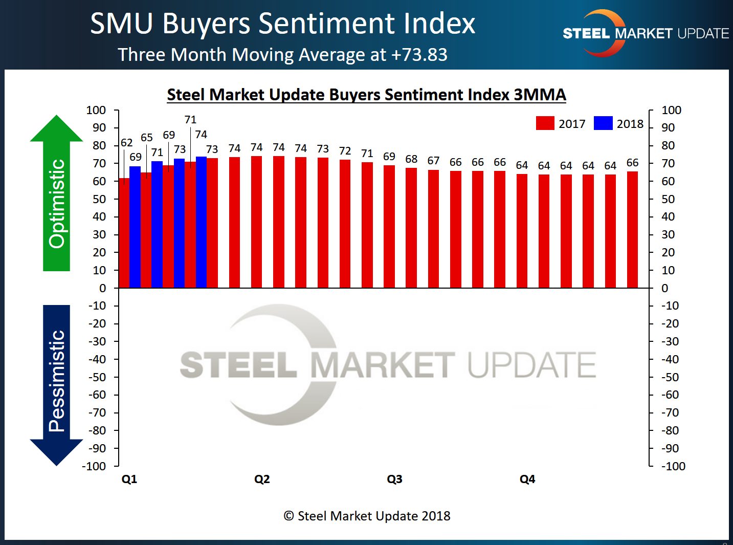 Current and future sentiment among flat rolled steel buyers showed a slight dip this month, due in part to the uncertainty over possible government trade action against imports. Viewed as a three-month moving average, however, industry optimism remains near record highs, according to the latest Steel Market Update Steel Buyers Sentiment Index.