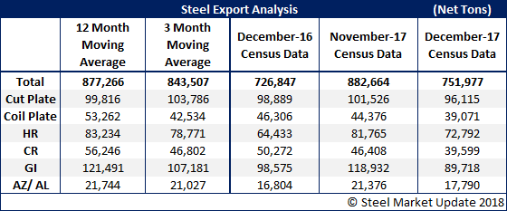 U.S. steel exports in December totaled 751,977 net tons (682,183 metric tons), down 14.8 percent from November, but up 3.5 percent from December 2016. Total exports have averaged around 885,000 tons over the last few months after reaching a 2.5-year high in May (1,006,087 tons). The total December export figure is below the three-month moving average (average of October, November and December 2017), and also below the 12-month moving average (average of January 2017 through December 2017). Total 2017 exports were 10,527,188 tons, up 13.0 percent from 9,313,197 tons in 2016. Here is a breakdown of flat rolled and plate steel exports: