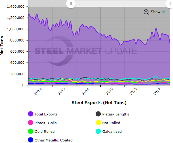 To see an interactive graphic of our Steel Exports history (example below), visit our website here. If you need any assistance logging in or navigating the site, contact us at info@SteelMarketUpdate.com or 800-432-3475.