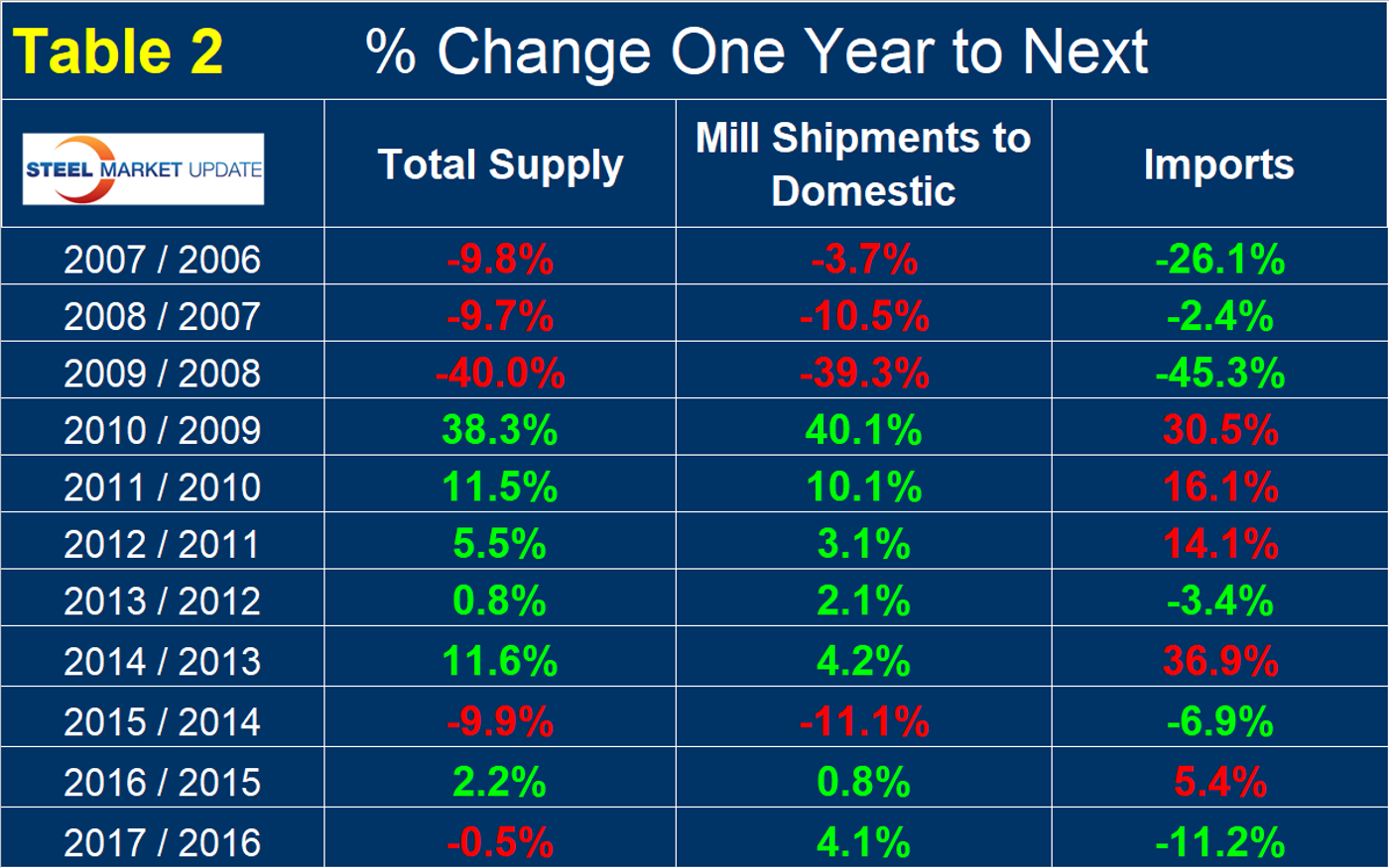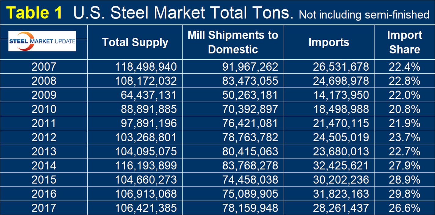 Table 1 shows 11 years of history of total steel supply to the U.S. market broken down into shipments from domestic mills and imports, excluding semi-finished. The hot rolled steel market totaled 106.4 million tons in 2017. Supply increased for five consecutive years 2010 through 2014, declined in 2015 and was relatively flat in 2016 and 2017. In 2017, imports excluding semis totaled 28.3 million tons.
