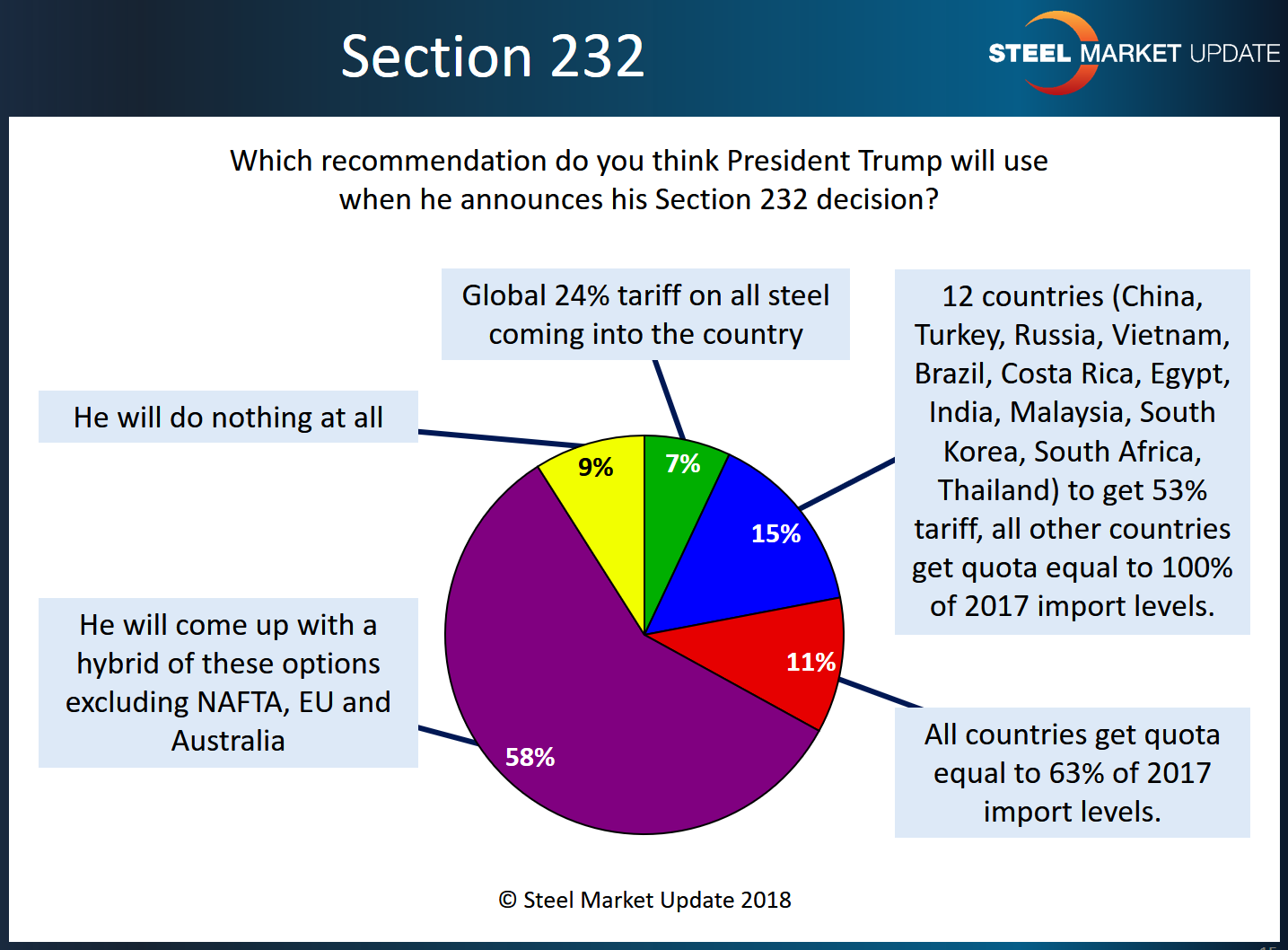 President Trump has made no official announcement about his plans for Section 232, leaving the steel market to speculate on last week’s Commerce Department recommendations. The majority of respondents to this week’s Steel Market Update market trends questionnaire are guessing he will come up with his own solution to combat unfair imports.