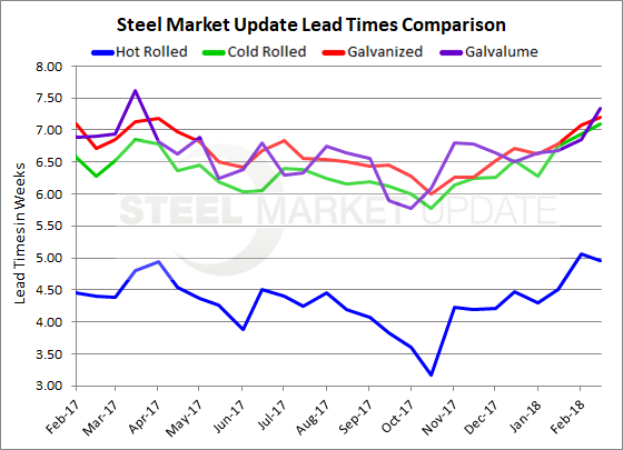 Hot rolled lead times now average 4.95 weeks, up from 4.50 weeks a month ago. Hot rolled lead times have extended by almost two weeks since steel prices began their rise in October.