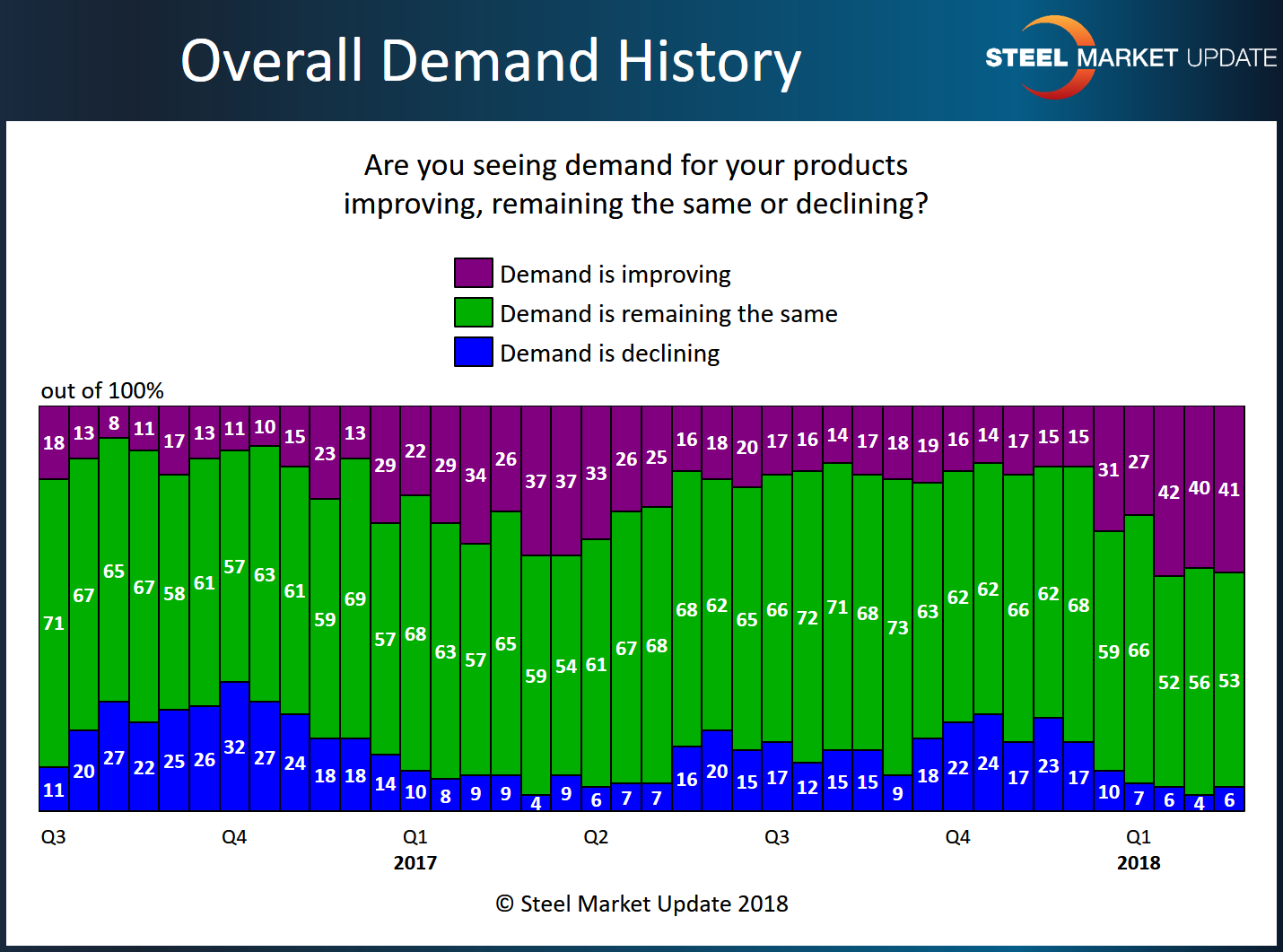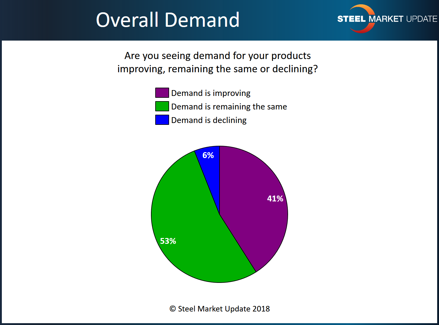 About 41 percent of all the respondents to last week’s Steel Market Update market trends questionnaire reported improving demand for their products. Another 53 percent said demand remained the same. Only 6 percent felt demand was declining.