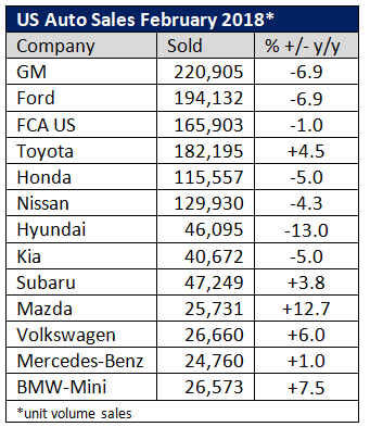 WardsAuto reported February sales at 1.29 million units, down from 1.32 million units a year ago. The seasonally adjusted annual rate of 17 million slid from 17.2 million in January and 17.3 million in February 2017.