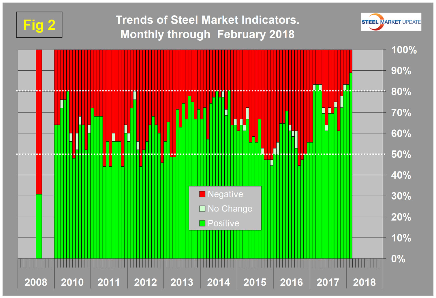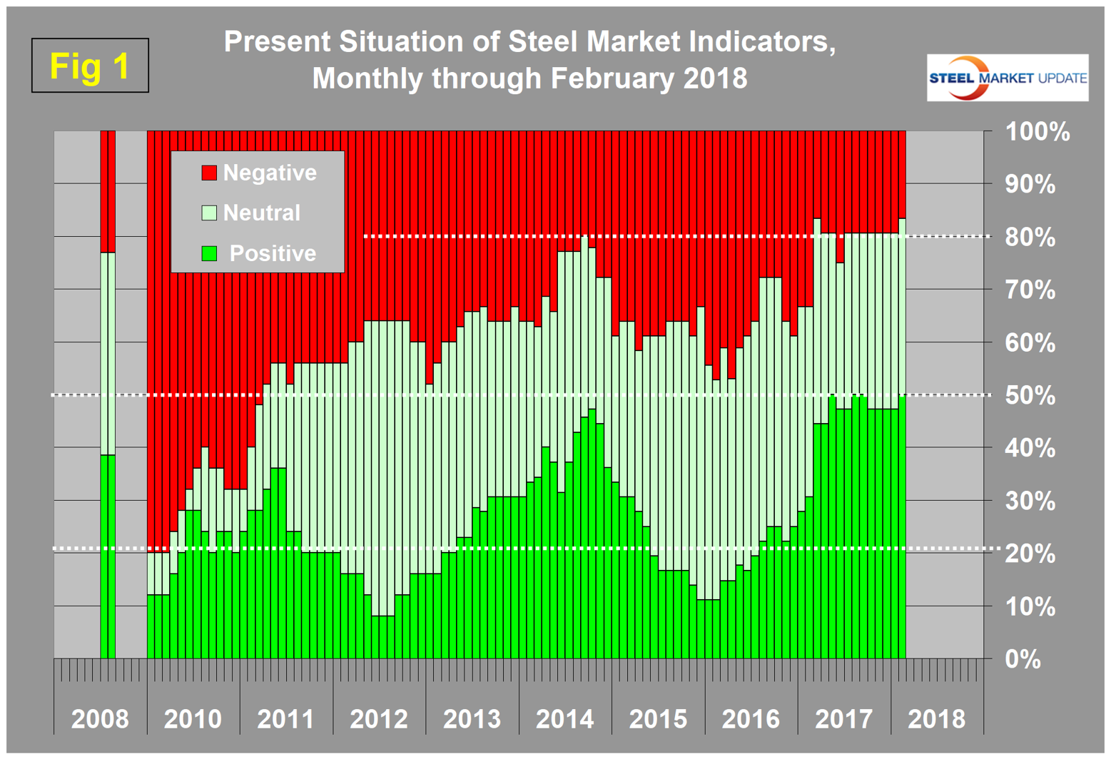 Key market indicators, and the trends they reveal, are the best they have ever been in Steel Market Update’s analysis. Data released in February shows that 18 of the 36 indicators are historically positive with only six negative. The balance is within the band of historically normal. Trends improved with 32 of the indicators heading in a positive direction, up from 22 in October and from 30 in January. Trends lead the present situation by about four months.