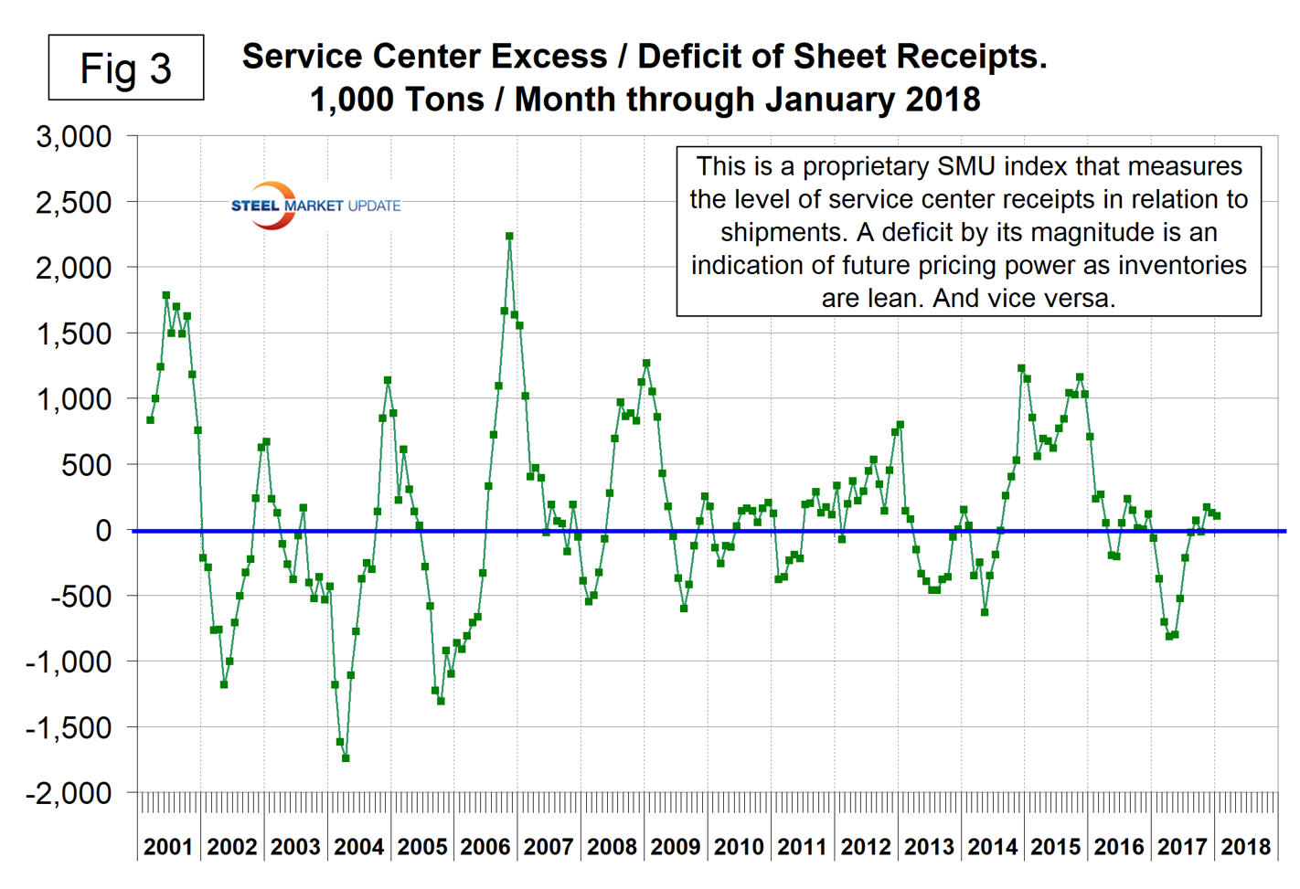 Our observations about trends in the February data are as follows: The second estimate of the growth of GDP was released Feb. 28 and at positive 2.49 percent was almost unchanged from the first estimate. In the General Economy section of Table 1, there was one trend reversal when data from The Conference Board released yesterday showed a positive surge in the February data. There were no trend reversals in the SMU proprietary indexes section. Service center excess of sheet products declined slightly in the January data. We regard an inventory deficit to be positive in terms of pricing power. In January, the surplus declined from 126,000 tons to 103,000 tons (Figure 3). Historically, this is very close to zero, therefore we are presently in a situation of negotiation neutrality.