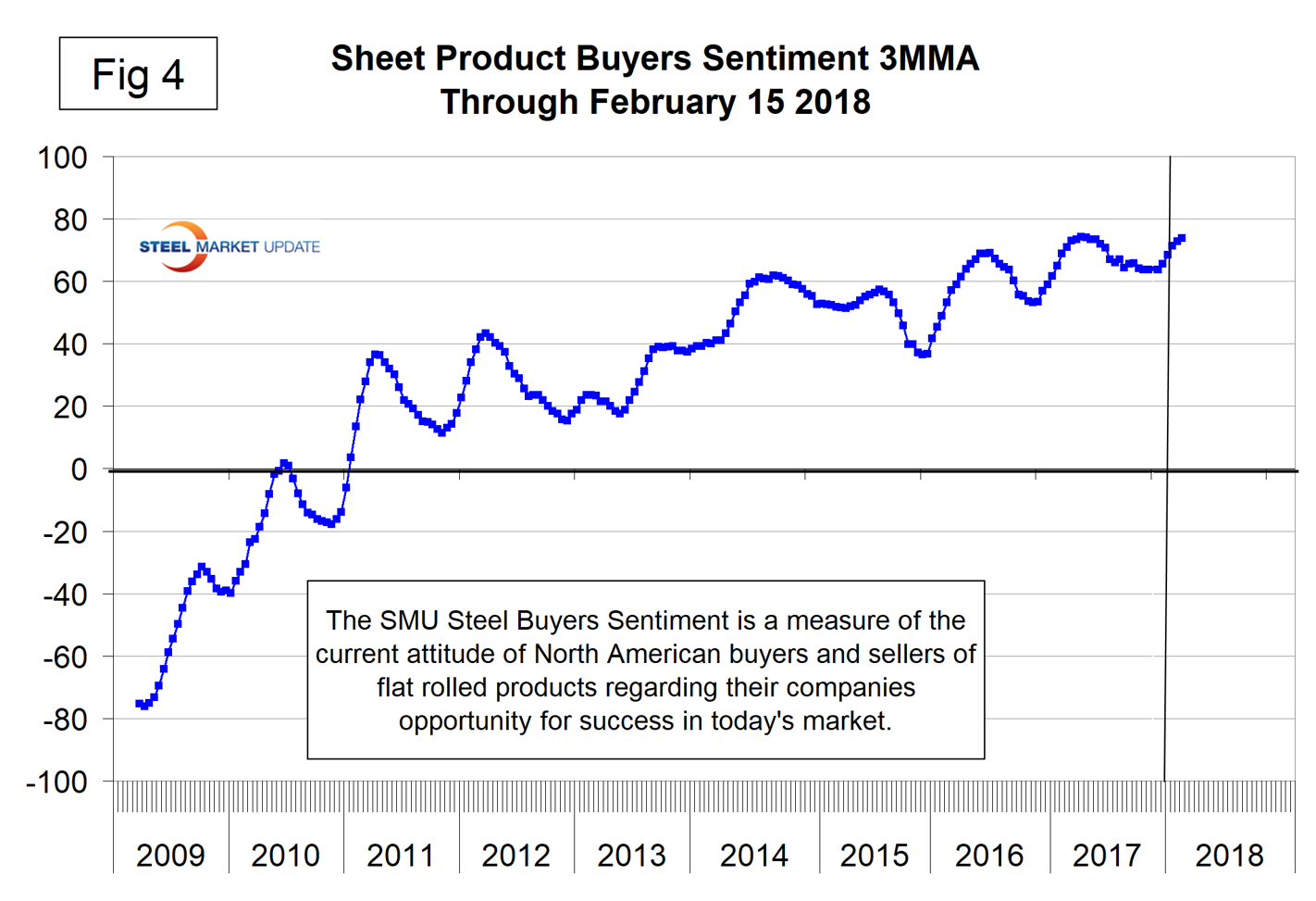 Steel buyers’ sentiment continued to strengthen through mid-February after reversing direction in December. The sentiment index was 73.83 on Feb. 15, close to its all-time high of 74.17 at the end of March last year (Figure 4).