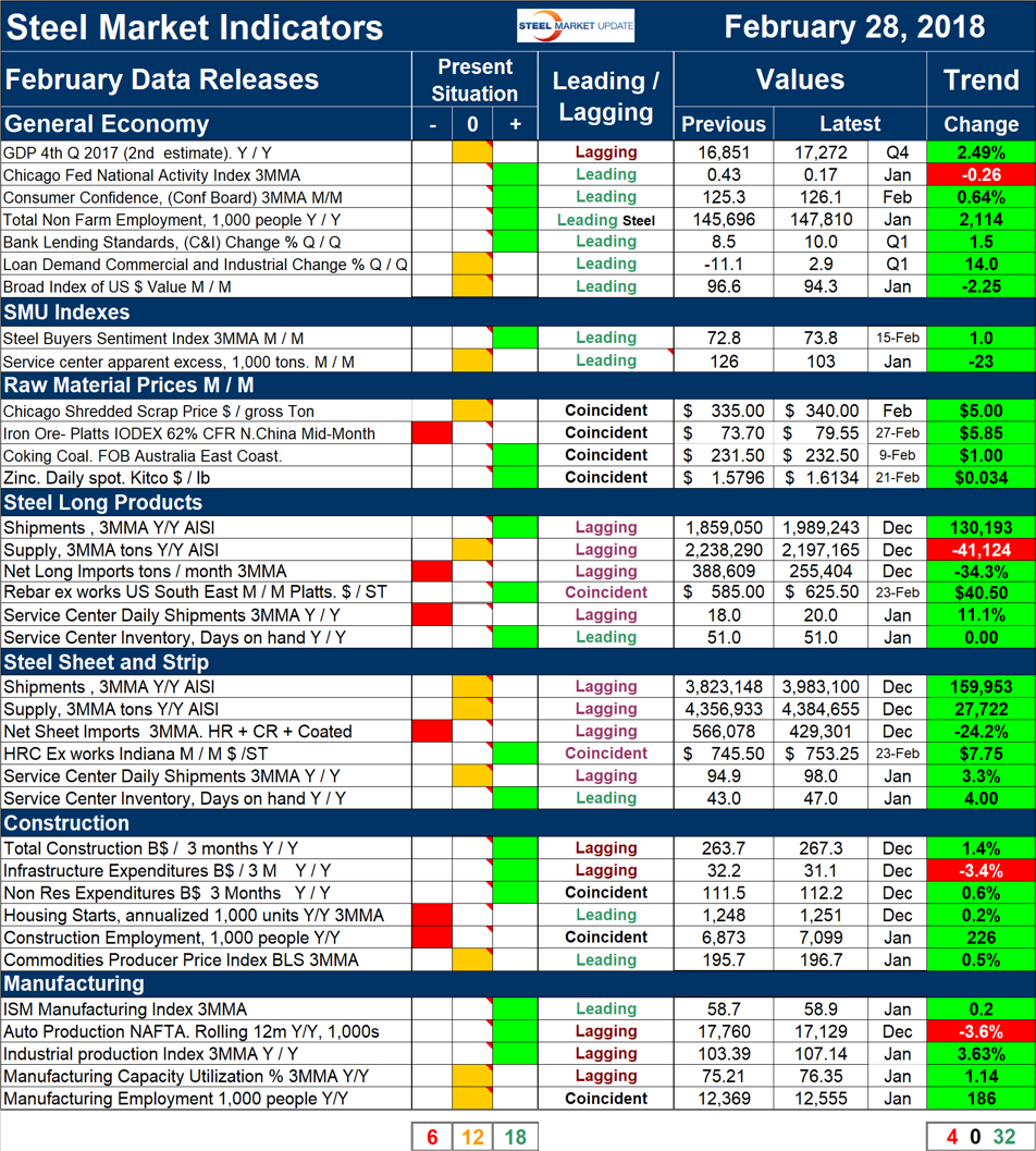 In the long steel products sector, apparent supply reversed direction and trended negative year over year driven by the performance of both heavy and light structural products. The price of rebar was unchanged in December, but continued its upward trajectory in January and February. In the sheet sector, all indicators are trending positive, which was a continuation of the December and January situation. In the construction sector, there were no trend reversals. Five of the six indicators are trending positive. The only negative continues to be infrastructure expenditures, which have trended negative every month since February 2017. In the manufacturing sector, the ISM index reversed direction and trended positive. Four of the five manufacturing indicators are trending positive, the only exception being auto production in NAFTA
