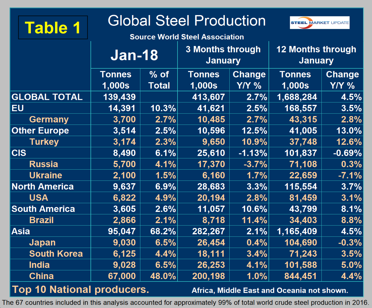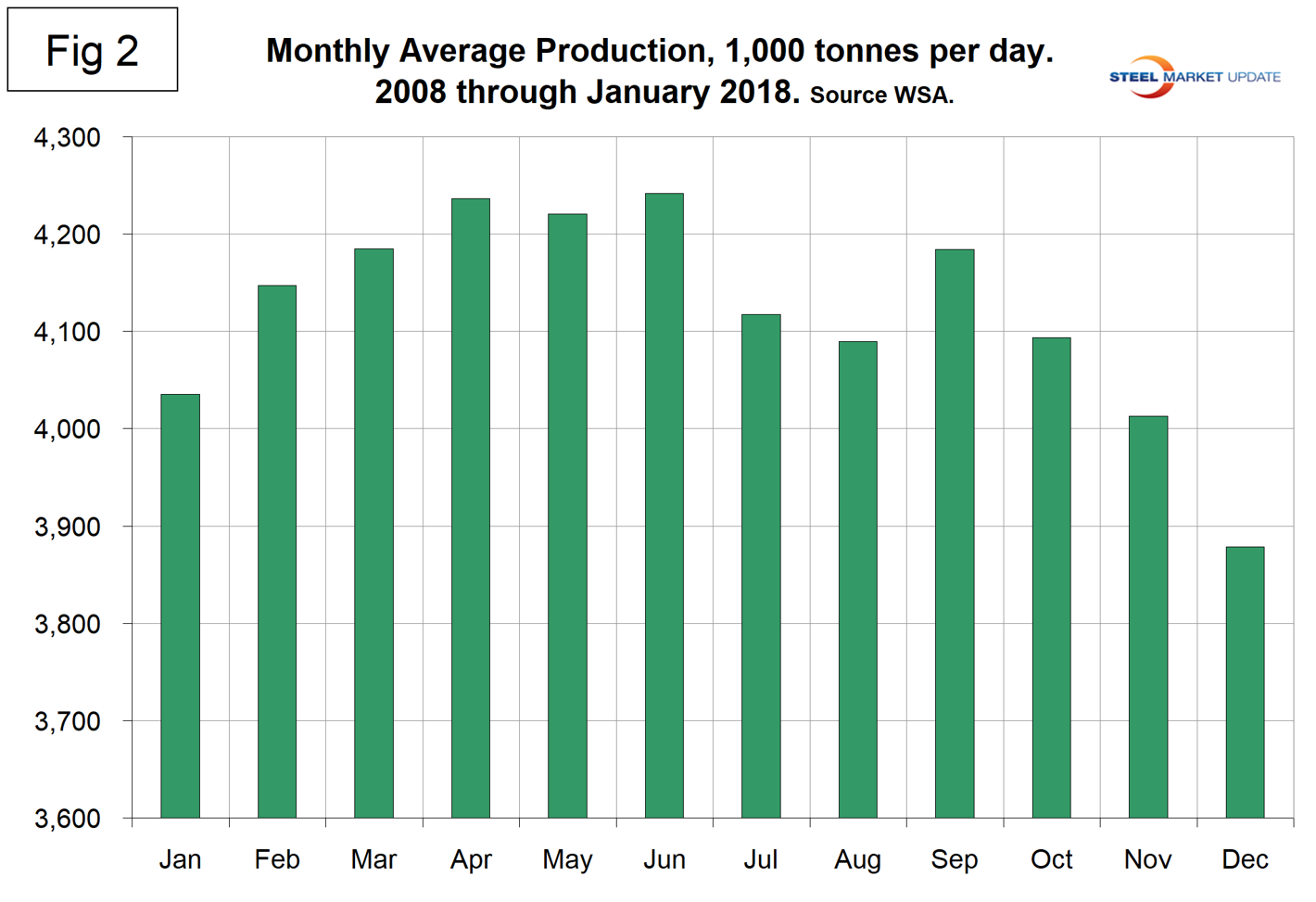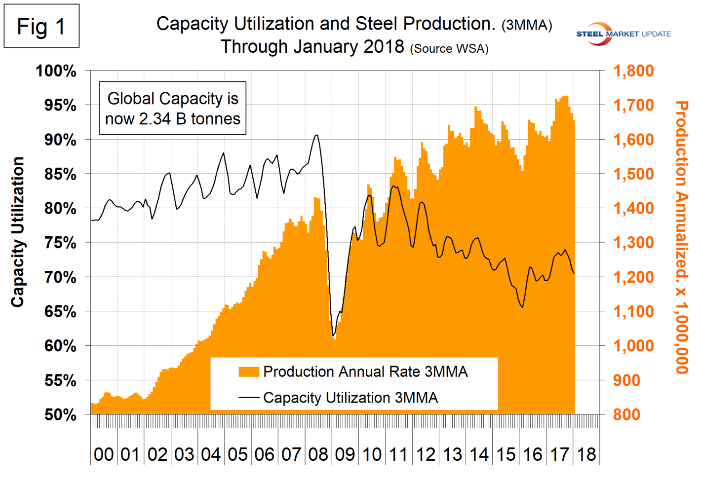 In 2017, total global steel production hit 1.687 billion metric tons, up by 5.2 percent from 2016. Production in the month of January 2018 totaled 139,439,000 metric tons, up from 137,574,000 in December. Capacity utilization in January was 71 percent. The three-month moving averages (3MMA) that we prefer to use were 137,869,000 metric tons and 70.5 percent, respectively. Figure 1 shows monthly production and capacity utilization since January 2000. The summer slowdown that has occurred in each of the last seven years was delayed until November last year. On a tons-per-day basis, production in January was 4.498 million metric tons with a 3MMA of 4.496 million metric tons. The all-time high was in June 2017 at 4.695 million metric tons. In three months through January, production was up by 2.7 percent year over year. Capacity utilization was on an erratically downward trajectory from mid-2011 through February 2016 when it bottomed out at 65.5 percent. In December 2016, the OECD’s steel committee estimated that global capacity would increase by almost 58 million metric tons per year between 2016 and 2018 bringing the total to 2.43 billion tons. That forecast is coming to pass as capacity is now 2.34 billion tons.