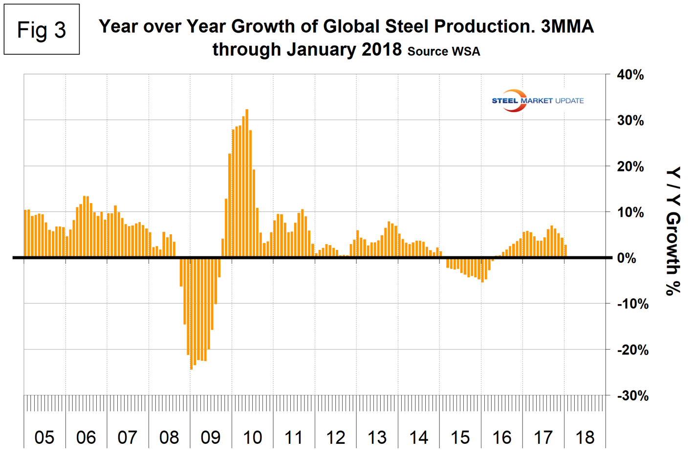 SMU Comment: On a 3MMA basis year over year through January, the world as a whole had a growth rate of 2.7 percent, but China grew at 1.0 percent and the rest grew at 4.8 percent. This is an encouraging trend if it continues because it means that Chinese pressure on the global market is easing. WSA increased its forecast for production in 2018 from 1,548.5 million metric tons in April to 1,648.1 million metric tons in its October forecast. This would be a projected growth of 1.6 percent in 2018, which based on the present momentum seems low. Globally, steel is back on a roll, driven primarily by construction in the developing world. The emerging and developing economies saw their GDP decline from 2010 through 2015 after which there was a turnaround that the IMF believes will continue through the 2022 forecast. We expect the IMF to raise the forecast of global growth in its April update.