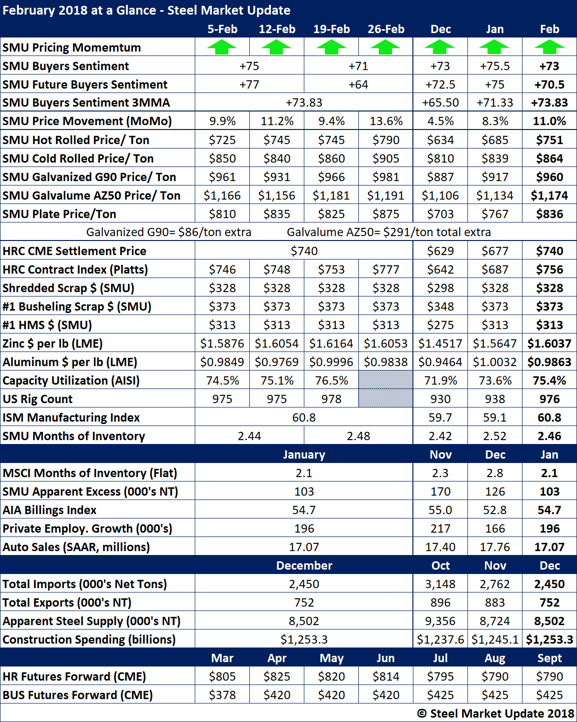 There were no surprises in this month’s data as our SMU Price Momentum continued to reflect higher steel prices, and that expectation continues over the next 30 to 60 days. Our SMU Steel Buyers Sentiment Index is at, or very near, all-time highs for our index. Buyers and sellers of flat rolled steel are optimistic about their company’s ability to be successful in the current market situation, as well as three to six months into the future.