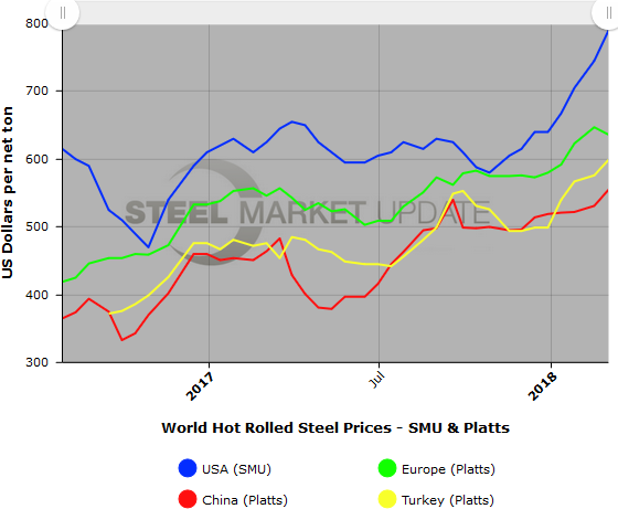 Platts published Turkish export prices at $599 per net ton FOB Turkish port, up $23 from two weeks ago. Adding $90 in import costs, the Turkish HRC “to the U.S. ports” price is $689 per ton. This puts the spread between the Turkish and U.S. HR price at +$101 per ton, meaning HR from the U.S. is theoretically $101 per ton more expensive than steel imported from Turkey. The Turkey/U.S. price spread has increased week by week since September/October 2017 when it dropped down to -$36 per ton (meaning domestic HR was $36 per ton cheaper than importing Turkish HR).