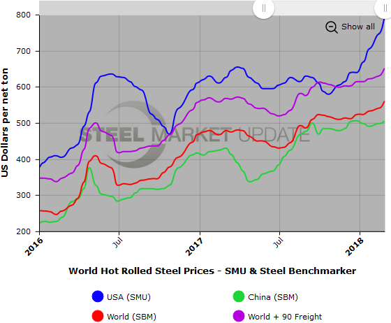 The SteelBenchmarker world export price for hot rolled bands is $560 per net ton FOB the port of export, according to data released by SteelBenchmarker on Monday, Feb. 26. This is up $20 per ton from two weeks ago. Adding in $90 in estimated import costs, that puts prices around $650 per ton delivered to the U.S. As previously mentioned, the Steel Market Update hot rolled price average this week is $790 per ton.