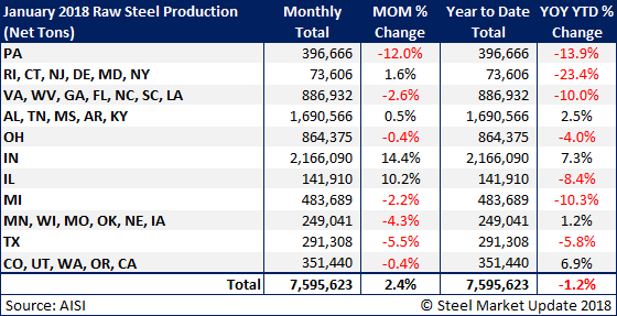 Total raw steel production for the month of January was 7,595,623 net tons, with 5,129,878 tons produced by electric arc furnaces (EAFs) and 2,465,745 tons produced by blast furnaces. This is the highest monthly production figure seen since August 2017 when 7,824,820 tons were produced. January raw steel production was 174,474 tons or 2.4 percent higher than the previous month, but 93,102 tons or 1.2 percent lower than the same month last year, reports the American Iron and Steel Institute (AISI) in Washington. AISI’s monthly estimates are different than the weekly estimates we report; the monthly estimates are based on over 75 percent of the domestic mills reporting versus only 50 percent reporting for the weekly estimates.