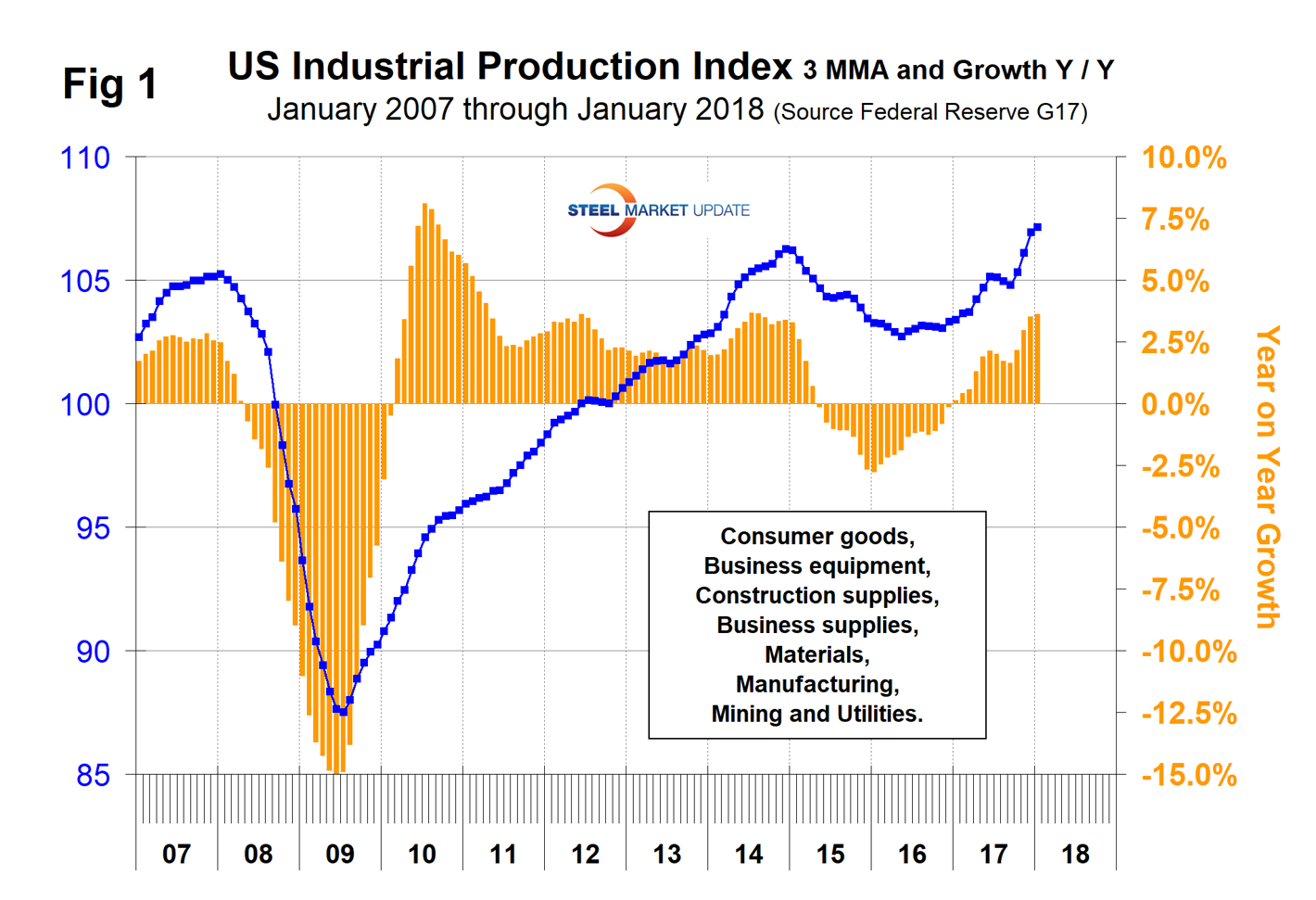 The Industrial Production Index: Figure 1 shows the IP index since January 2007 with the year-over-year growth. The three-month moving average (3MMA) had negative growth every month from October 2015 through December 2016 as shown by the brown bars in Figure 1. January 2017 was the first month of positive growth in the 3MMA since August 2015. Growth continued to be both positive and improving through January 2018. Manufacturing capacity utilization improved from 75.21 percent in January 2017 to 76.35 percent in January 2018 on a 3MMA basis.