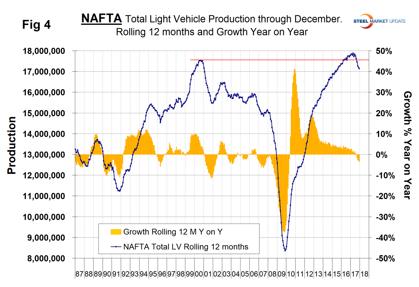 Light Vehicle Production in NAFTA: Our data source has not been updated for January, therefore our comment remains the same as last month. We don’t expect any rapid change in auto assemblies since sales are gradually declining. On a rolling 12-months basis year over year through December, light vehicle production in NAFTA decreased by 3.6 percent. Through December, growth declined for six straight months. These were the first months of contraction since May 2010. There has been a very gradual slowdown in growth for the last three years as indicated by the brown bars in Figure 4. The data source is Ward’s Automotive. We understand that the main hang-up in the NAFTA negotiations revolves around auto parts manufacture and final point of assembly. There is a huge movement of components and subassemblies in both directions across the southern border. Therefore, it is not known whether the Ward’s data exaggerates or deflates the national differentials.