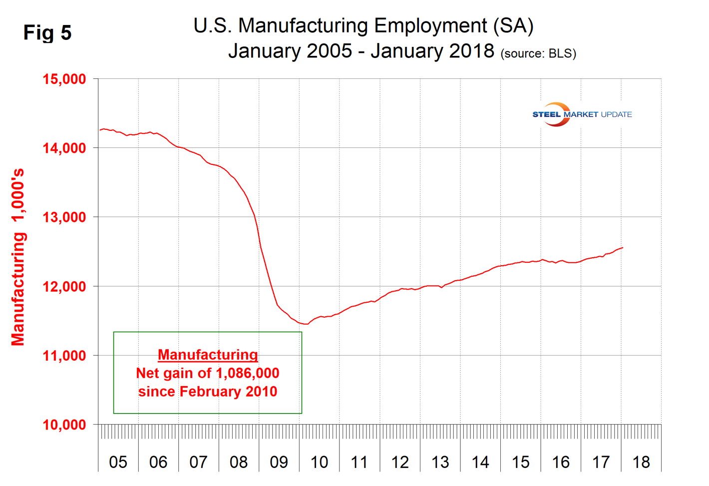 Manufacturing Employment: Manufacturing employment plummeted during the recession and gradually improved from the spring of 2010 through 2014. Growth was flat in 2015 and declined slightly in 2016 when 23,000 jobs were lost during the year. There was a turnaround in 2017 when 196,000 jobs were created, 79,000 of them in the fourth quarter alone (Figure 5). The improvement continued through January 2018, which contributed to a 131,000 gain in jobs in six months August 2017 through January 2018. The motor vehicles and parts subcomponent of manufacturing employment had a net gain of only 2,000 jobs in the 13 months January 2017 through January 2018.